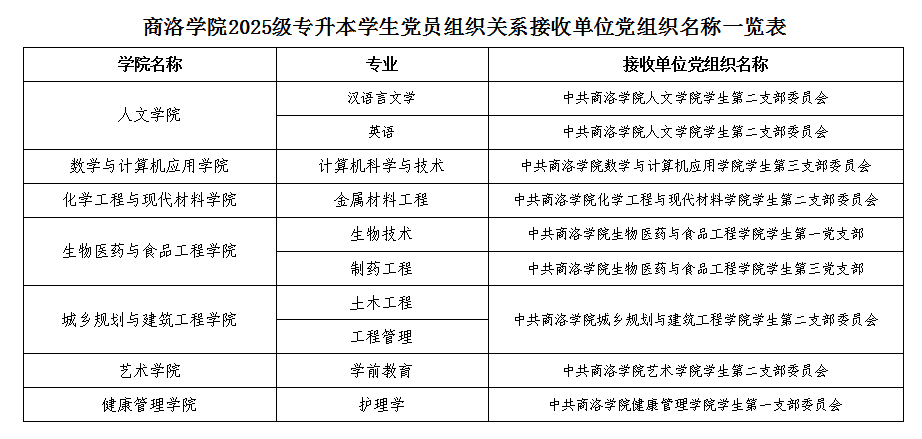 商洛学院2025级专升本学生党员组织关系接收单位党组织名称一览表