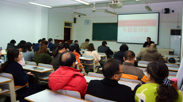 12月5日晚,校党委委员高荣发到艺术学院宣讲党的十九大精神。宣讲会由艺术学院党总支书记黄新春主持。