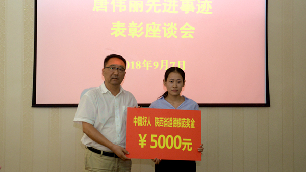 龙治刚代表学校向唐伟丽颁发5000元奖金。彭虎军宣读了《中共商洛学院委员会关于向“中国好人”“陕西省第五届道德模范”唐伟丽同学学习的通知》。