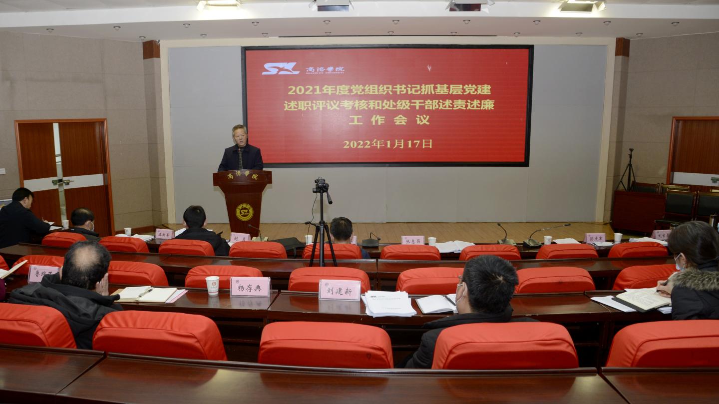1月17日,我校采取线上线下相结合的方式召开2021年度党组织书记抓基层党建述职评议考核和处级干部述职述廉工作会议,听取各党总支、直属党支部书记履行抓基层党建工作职责情况述职及处级干部述责述廉。全体校领导出席现场会议。校党委委员,纪委委员参加现场会议。8名党总支(直属党支部)书记及6名处级干部进行现场述职。其余8个党总部、直属党支部书记及68名处级干部人员采取书面形式述职和述责述廉。现场会议由党委副书记彭虎军主持。