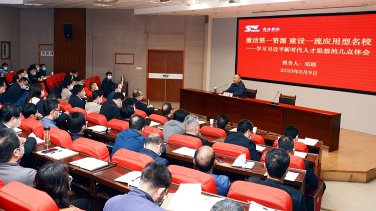 邓理在报告中以《激活第一资源建设一流应用型名校——学习习近平新时代人才思想的几点体会》为题,围绕“正确认识是前提;遵循制度是基础;德才兼备、以德为先是原则;用心尊重是关键;人人皆可成才、人人尽展其才是目的”等五个方面,详细阐述了习近平总书记关于新时代人才工作的重要论述重要指示精神,针对如何激发人才创新活力,为我校一流学院建设提供有力的人才支撑作出了具体指导。